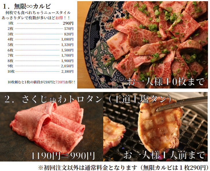 ニュー焼肉食堂匠は「タンとカルビ」推し!!お得にそして今までにない食べ方で提供させていただいております。